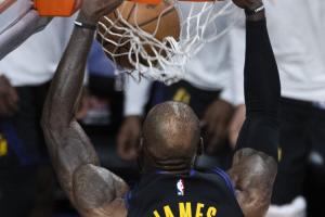 主持人问:“来看看湖人主场迎战爵士的比赛。如果掘金输球而湖人赢球,湖人本可以排在第三而不是第四。看,‘老人河’詹姆斯来了!他不需要扣篮,上篮就行了。他的扣篮时代是不是已经结束了?”