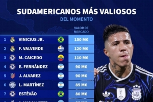 南美球员身价榜:维尼修斯1.5亿欧居首,巴尔韦德1.2亿欧次席
