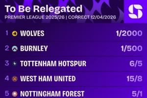 体育资讯04月12日讯 英超第32轮,热刺客场0-1不敌桑德兰深陷降级泥沼,相关机构更新了最新的英超降级赔率。